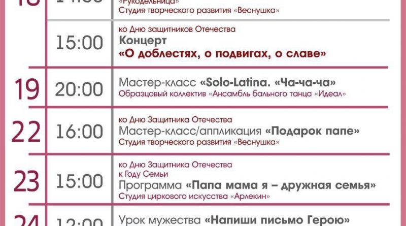 Читать далееАфиша мероприятий Дома культуры ЗИО на февраль (часть 1): 5 февраля в 20:00 Мастер — класс Solo-Latina. «Самба» Образцовый коллектив