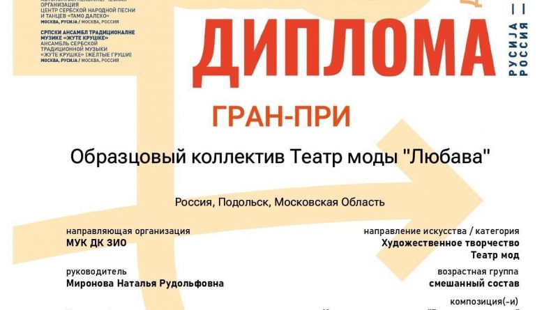 Читать далееВ рамках международного фестиваля искусств «Культурный обмен» состоялся 1-й международный российско-сербский многожанровый конкурс «Бели-Град». Образцовый коллектив театр моды «Любава» был