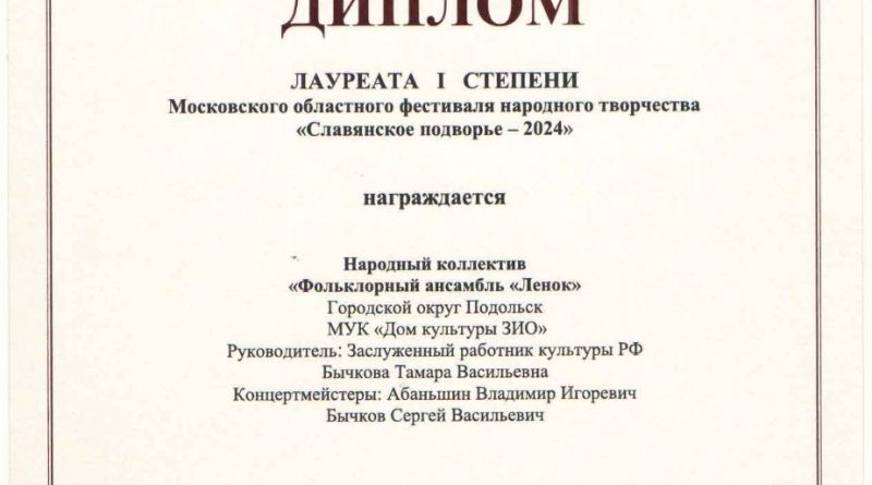 Читать далееПоздравляем народный коллектив «Фольклорный ансамбль «Ленок» с заслуженным званием Лауреата 1 степени Областного фестиваля «Славянское подворье»! Огромная благодарность руководителю Тамаре