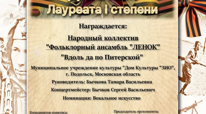 Читать далееНародный коллектив Фольклорный ансамбль «Ленок» с гордостью принял участие во всероссийском патриотическом конкурсе — фестивале «Звезда мира», посвященном 85-летию окончания