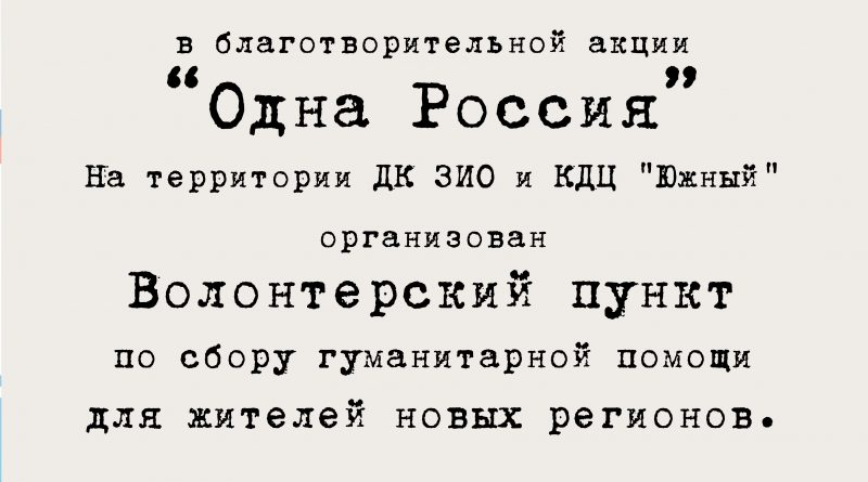 Читать далееС 23 по 30 сентября на территории Дома Культуры ЗИО будет организован пункт сбора гуманитарной помощи «Одна Россия». Друзья,