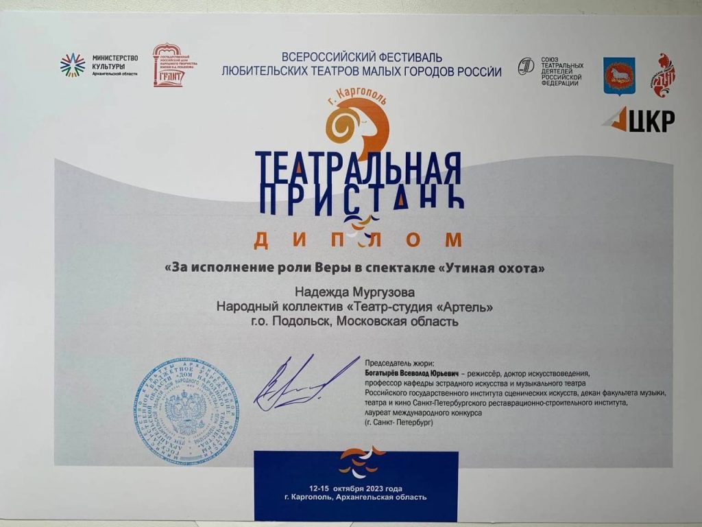 Всероссийский театральный фестиваль малых городов России ГРНДТ им. Поленова СТД РФ завершился в городе Каргополь Архангельской области. Участники фестиваля представляли 8 федеральных округов России, включая Архангельскую, Новосибирскую, Ростовскую, Ленинградскую, Свердловскую и Ярославскую области. Народный коллектив «Театр-студия «Артель» из МУК ДК ЗИО представлял Московскую область. Их спектакль «Утиная охота» по пьесе А. Вампилова получил теплый прием от публики и был признан победителем фестиваля.