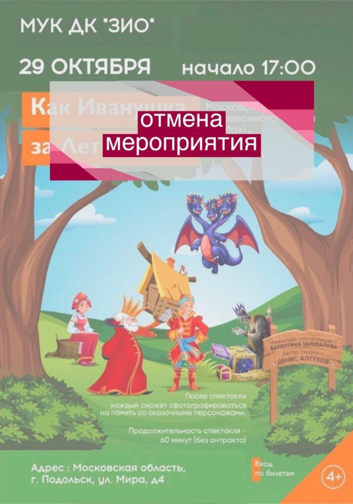 К сожалению, из-за непредвиденных обстоятельств мы вынуждены объявить об отмене двух мероприятий: 29 октября 17:00 спектакль «Как Иванушка за Летом летал» и 12 ноября 14:00 спектакль «Сказка о волшебной кошке».