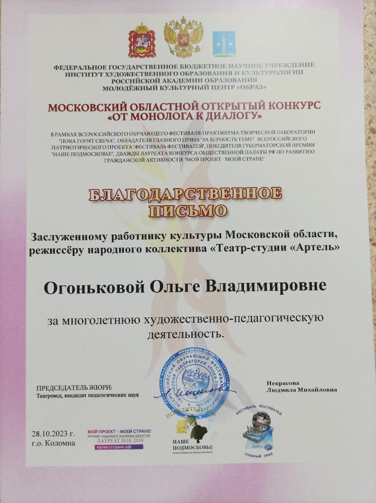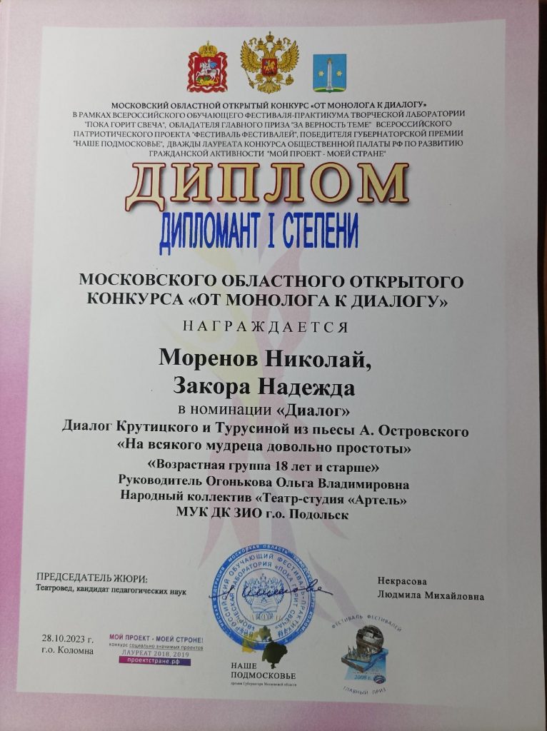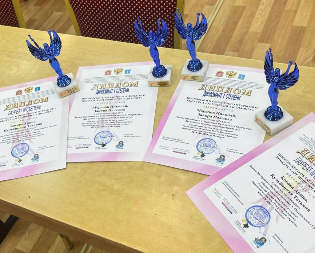 В городе Коломна 28 октября прошел Московский областной открытый фестиваль «От монолога к диалогу», в котором приняли участие актеры из театра «Артель». Их выступления в пьесах «Гроза» и «На всякого мудреца довольно простоты» были отмечены дипломами.