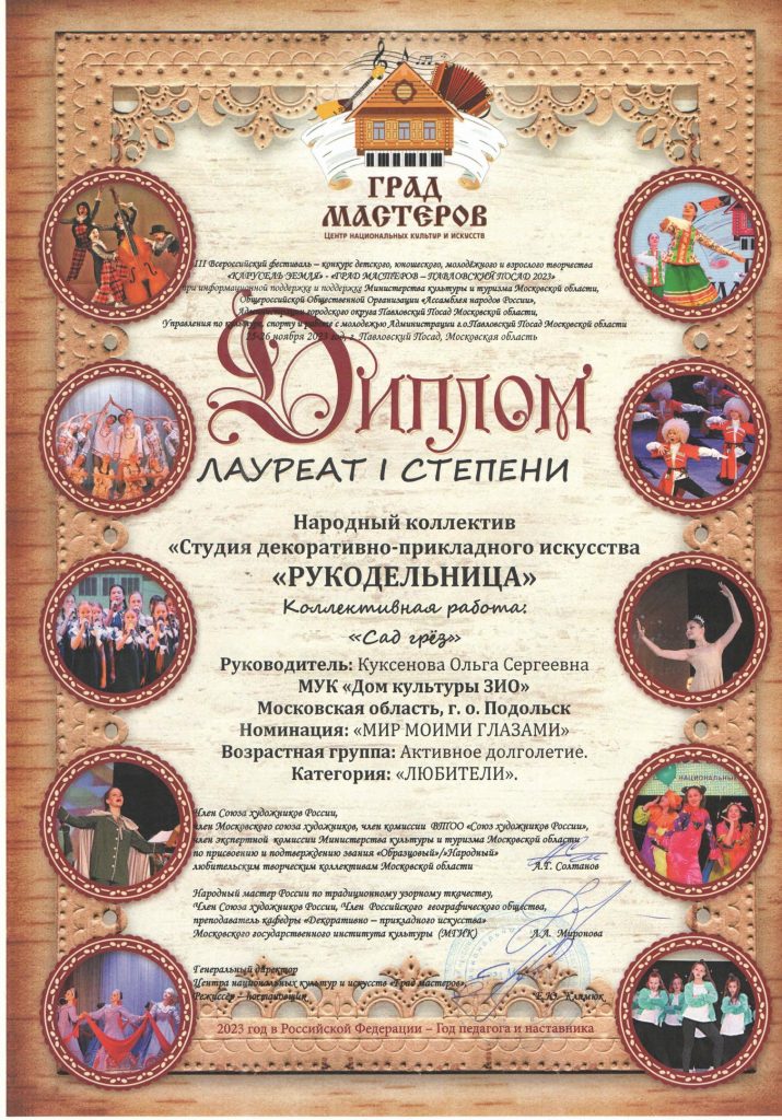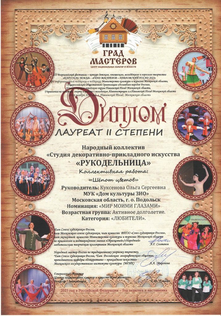 III Всероссийский фестиваль – конкурс национальных культур и искусств, детского, юношеского, молодёжного и взрослого творчества «КАРУСЕЛЬ ЗЕМЛЯ» — «ГРАД МАСТЕРОВ – ПАВЛОВСКИЙ ПОСАД 2023» прошёл 26 ноября. На этом фестивале от Дома культуры ЗИО принял участие народный коллектив Студии ДПИ «Рукодельница» и стал победителем.