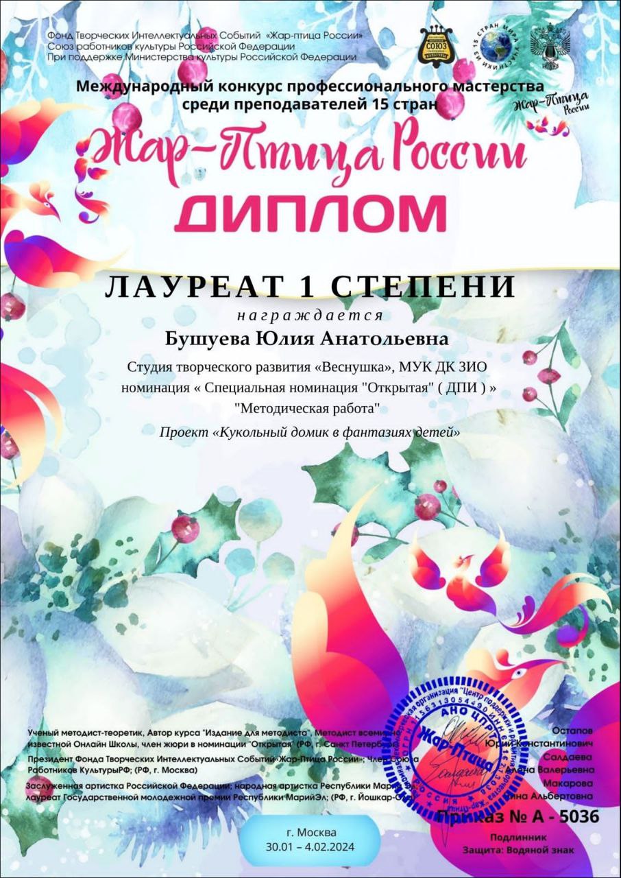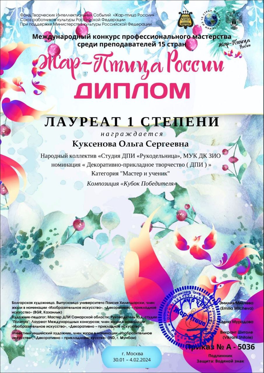 В Международном конкурсе профессионального мастерства среди преподавателей «Жар – птица России», в котором приняли участие представители 15 стран, особую яркость проявили руководитель Народного коллектива «Студия ДПИ «Рукодельница» Ольга Сергеевна Куксёнова и руководитель коллектива-спутника «Студия творческого развития «Веснушка» Юлия Анатольевна Бушуева. За свои выдающиеся достижения обе преподавательницы были награждены дипломами лауреатов 1 степени. Куксёнова Ольга Сергеевна получила заслуженное признание в номинации «Декоративно-прикладное творчество» в категории «Мастер и ученик» за композицию «Кубок победителя». А Бушуева Юлия Анатольевна была отмечена дипломом лауреата 1 степени в специальной номинации «Открытая» за проект «Кукольный домик в фантазии детей» в рамках категории «Методическая работа».