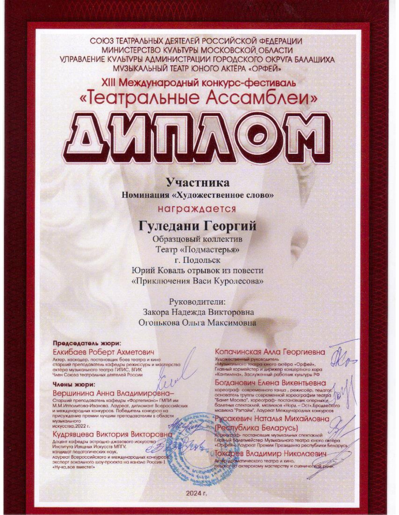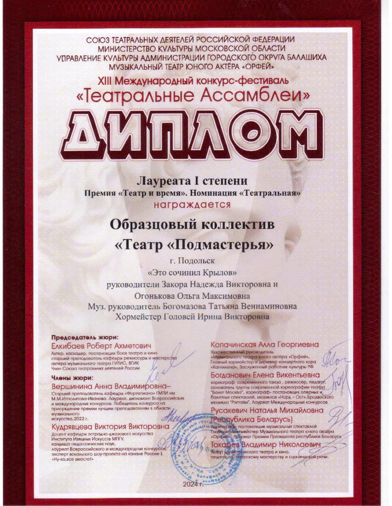 Дипломы Международного фестиваля «Театральные ассамблеи» I тур «Алые паруса» были вручены участникам детских театральных студий. Образцовый коллектив театра «Подмастерья» достойно представил свой премьерный спектакль сезона под названием «Это сочинил Крылов!». Результаты были впечатляющими — коллектив получил Лауреат I степени в номинации «Художественное слово». Чиркова Наталье был присужден Диплом I степени, Логинов Илье — Диплом III степени, а Гуледани Георгию — Диплом участника.