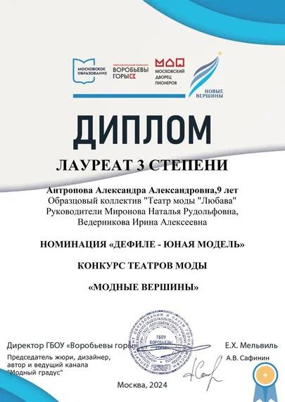 Лауреатом 3 степени стал образцовый коллектив театра моды «Любава» в номинации «Новая самобытность» и коллективная работа родителей и детей в номинации «Семейная мода».