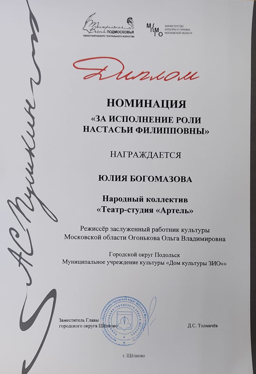 «За исполнение роли Настасьи Филипповны»- Юлия Богомазова