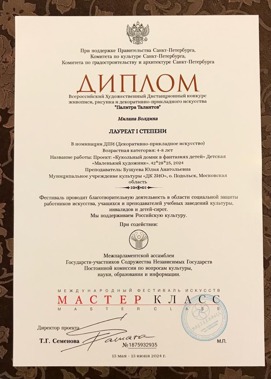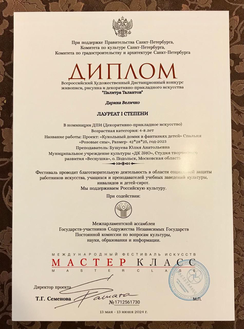 При поддержке правительства Санкт-Петербурга прошел Всероссийский Художественный Дистанционный конкурс «Палитра талантов», объединяющий живопись, рисунок и декоративно-прикладное искусство. Студия творческого развития «Веснушка» участвовала в номинации ДПИ (Декоративно-прикладное творчество) в возрастной категории 4-8 лет. Милана Болдина и Дарина Величко стали лауреатами 1 степени с проектами «Кукольный домик в фантазии детей» Детская «Маленький художник» и «Спальня Розовые Сны».