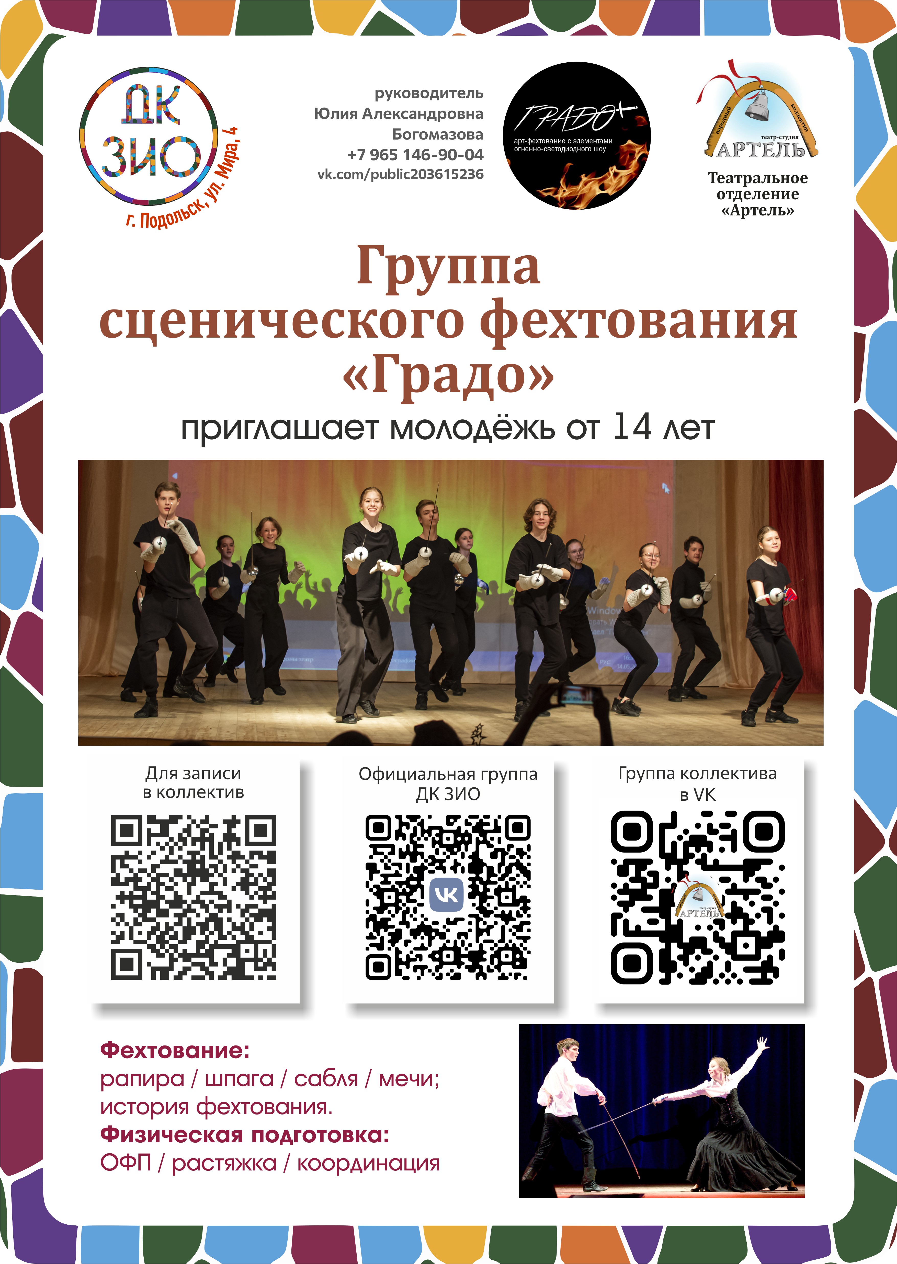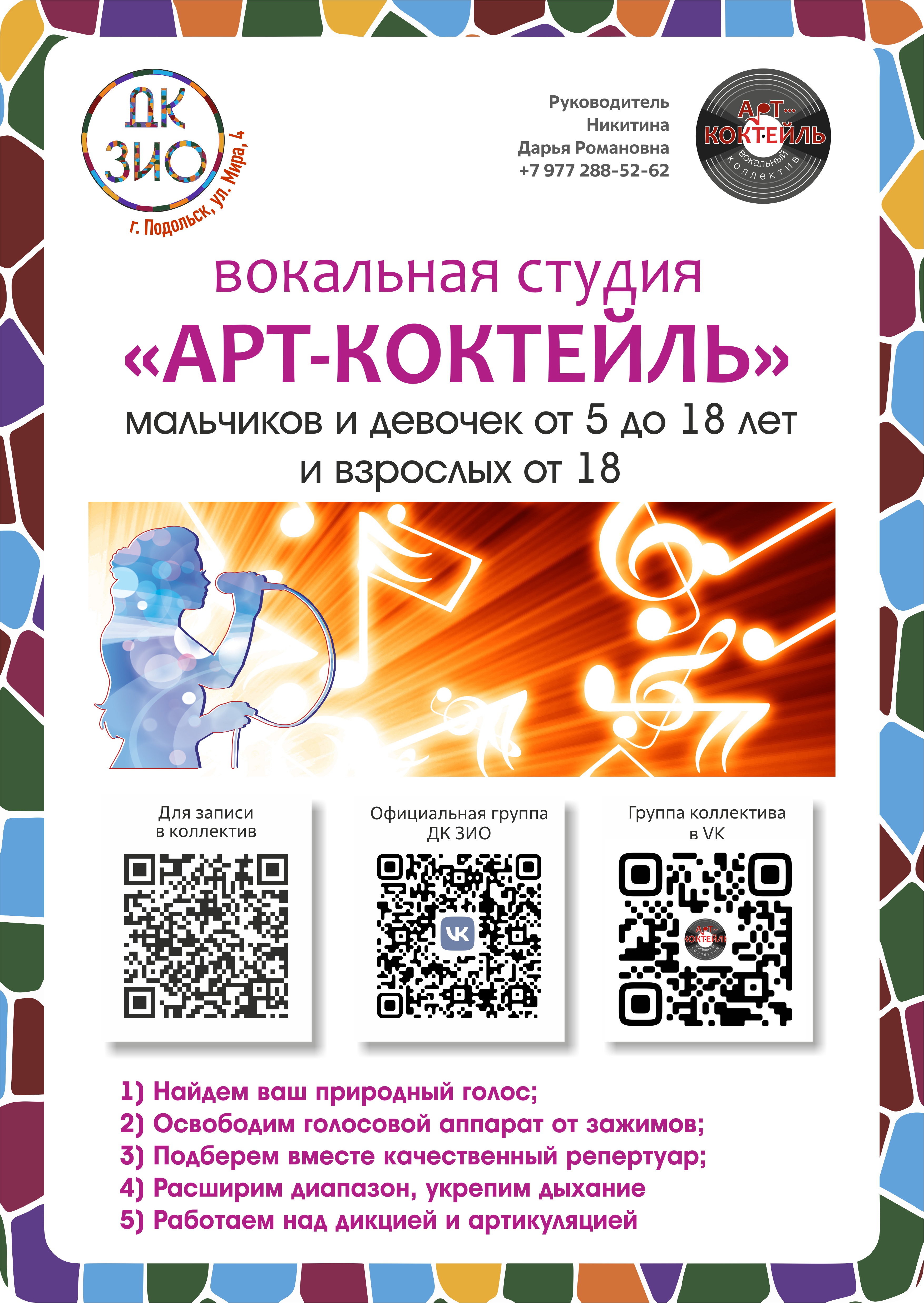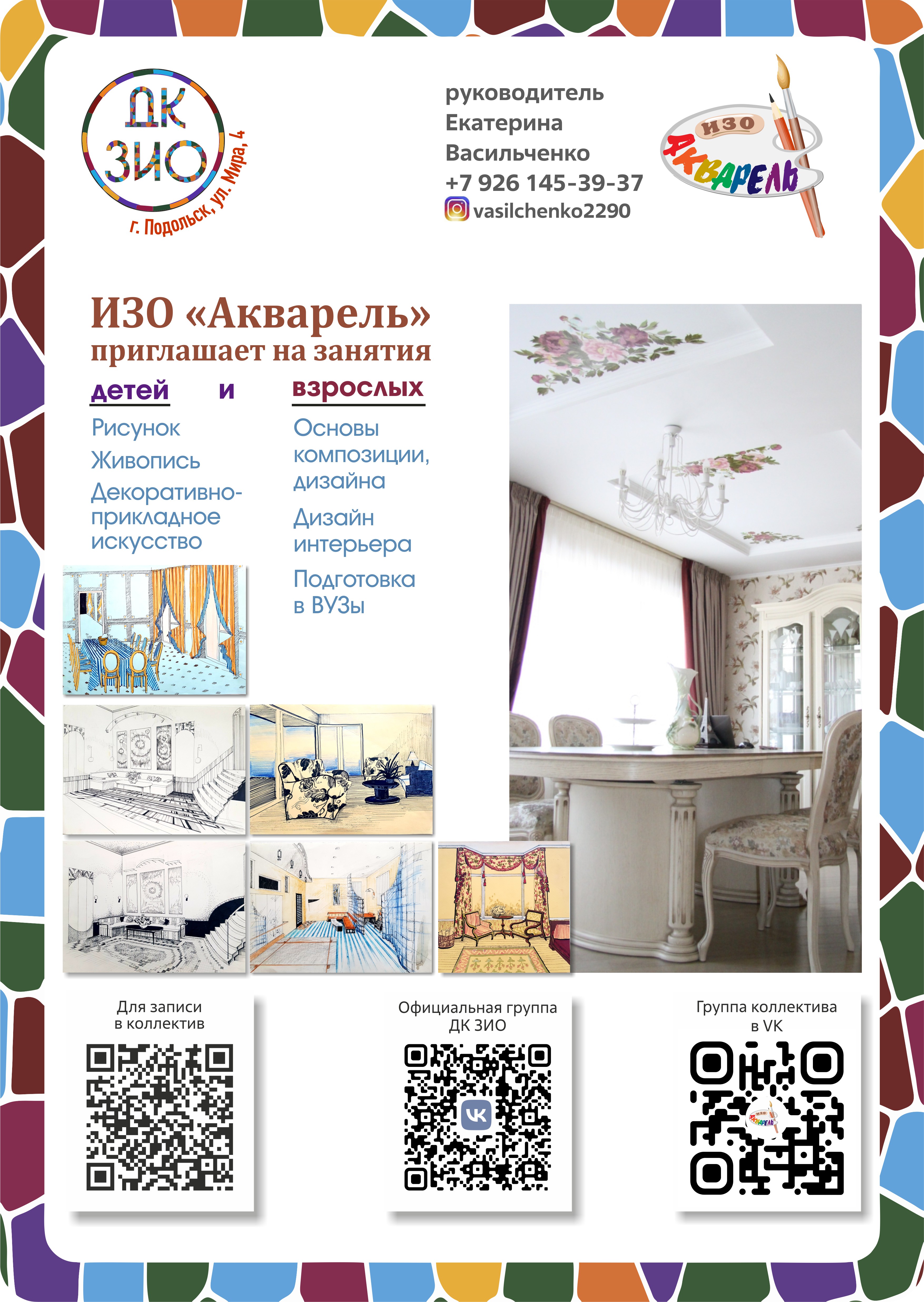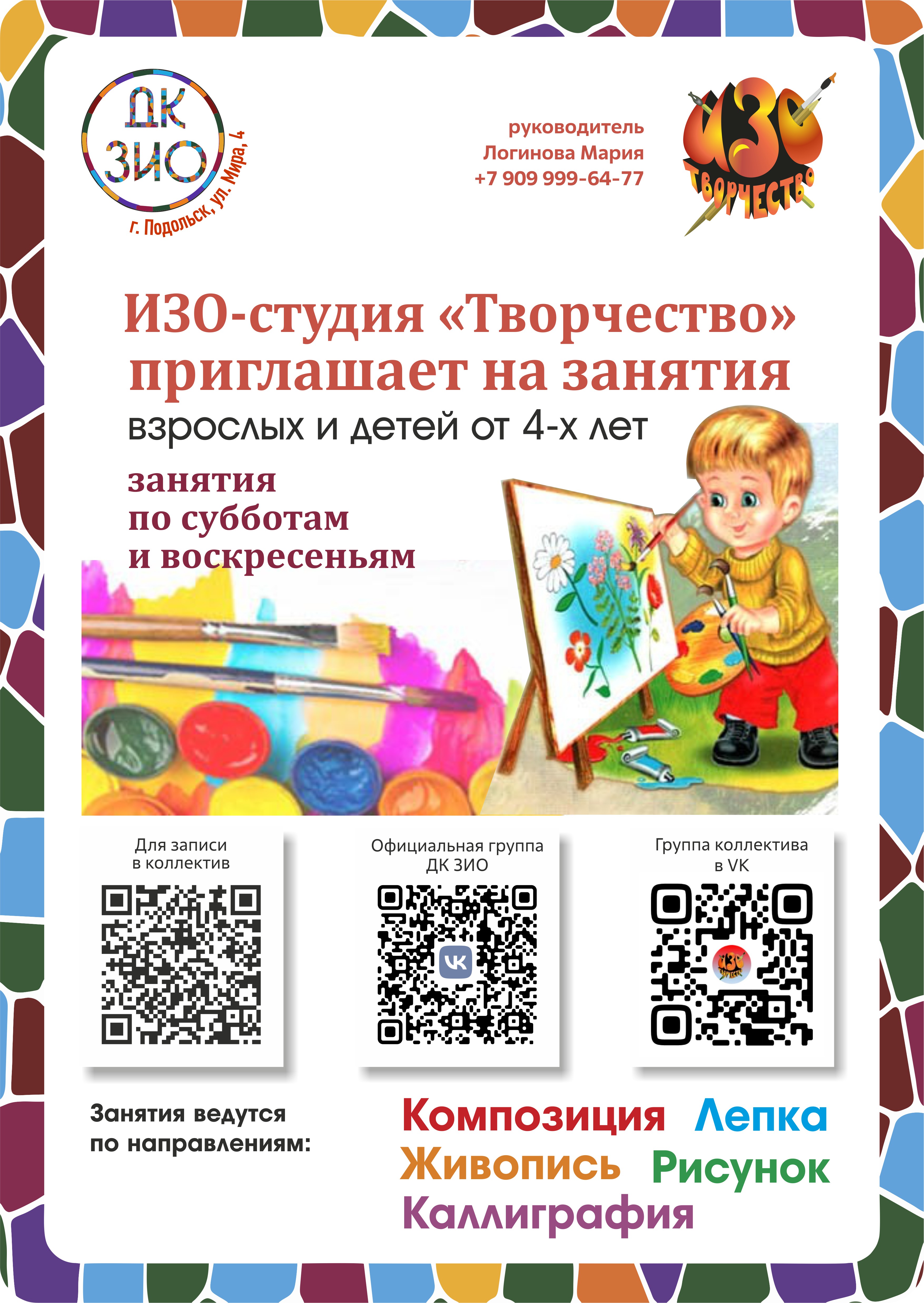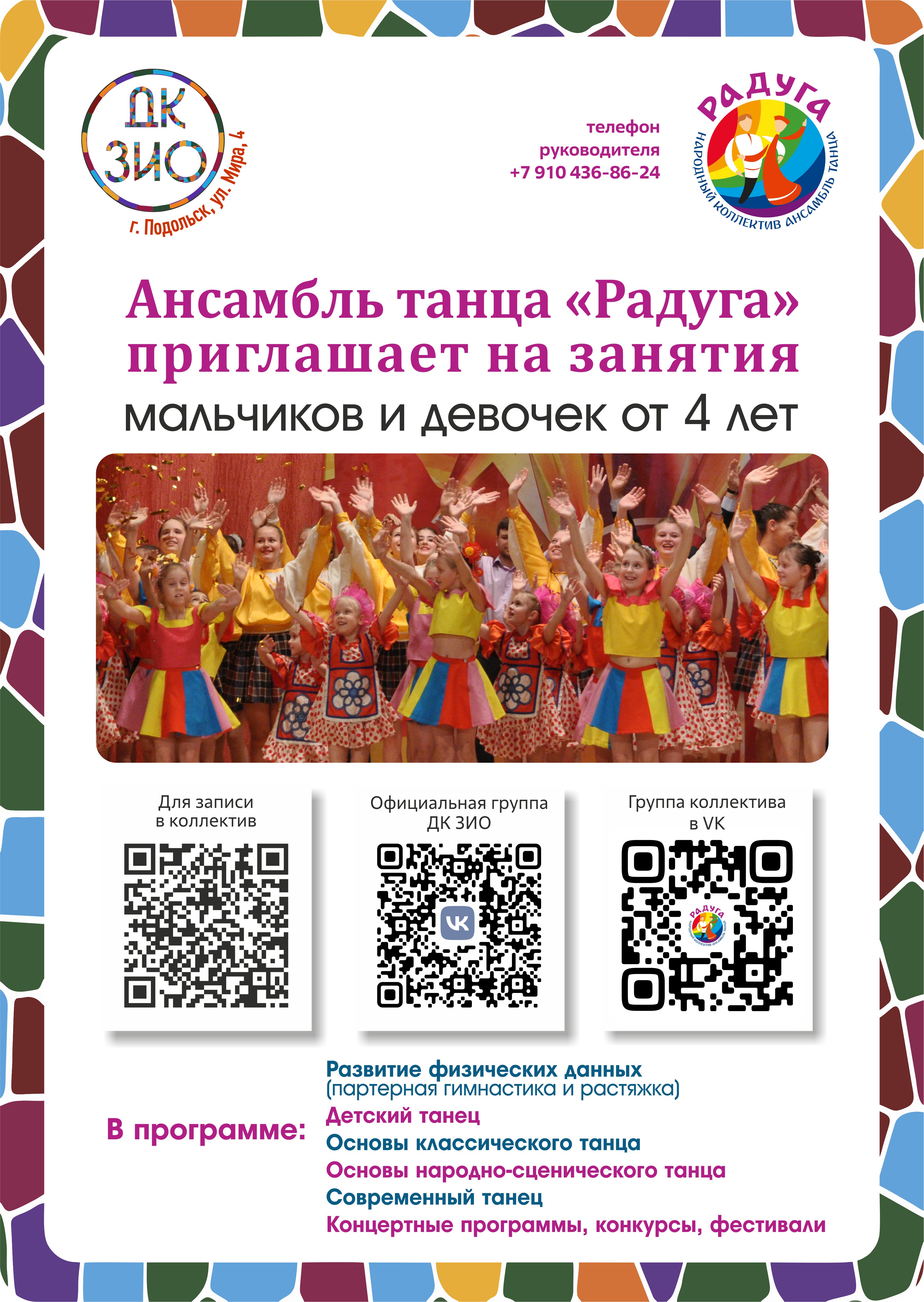 У нас представлены занятия для всех возрастных групп — от детей до взрослых, так же есть занятия по направлению активного долголетия. Для себя вы найдете классы по танцам, рисованию, музыке, театральному искусству и многому другому. Запись в коллективы уже открыта, так что вы можете присоединиться к нам. Начало занятий запланировано на сентябрь. Не упустите возможность развиваться и обрести новые навыки.