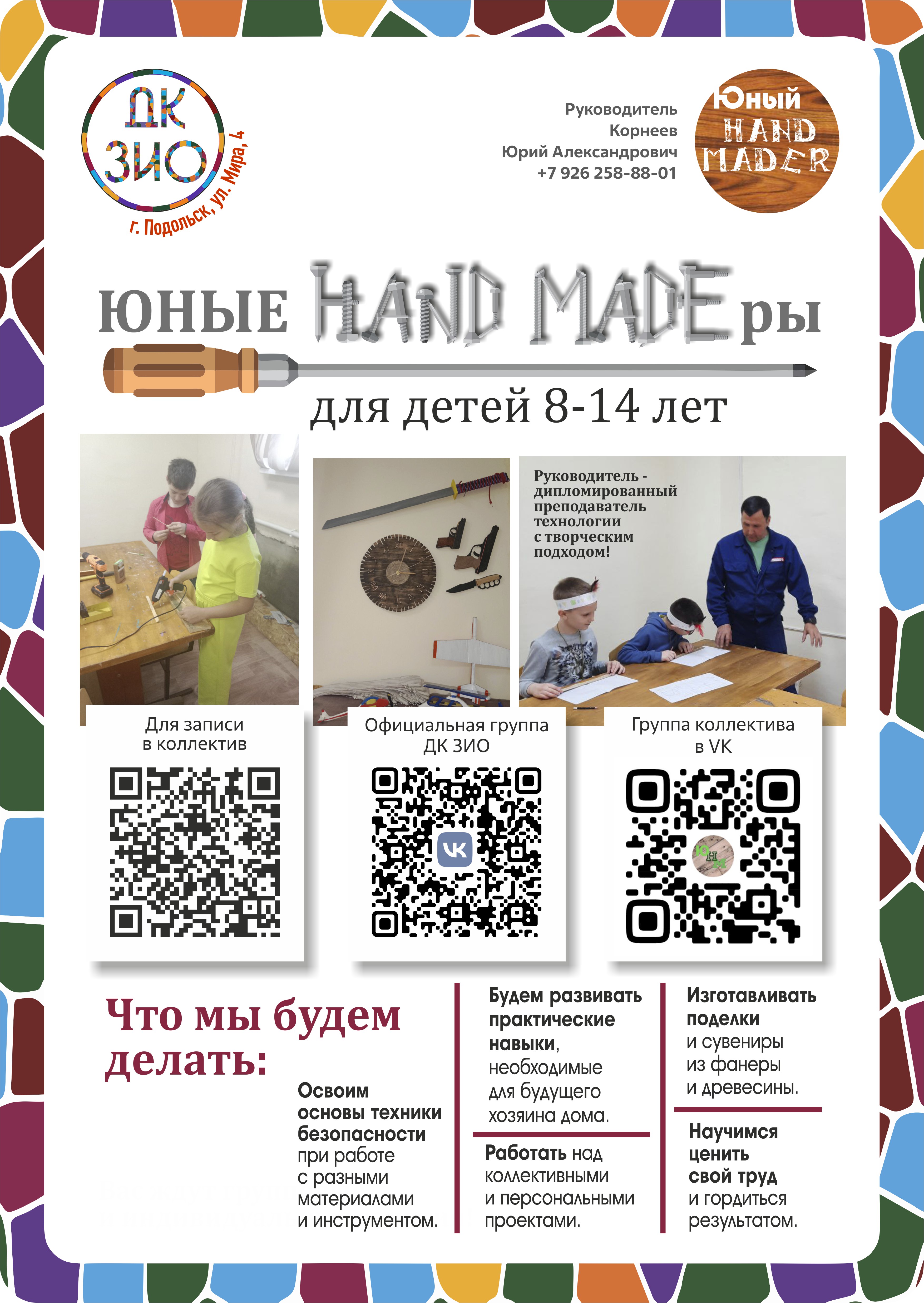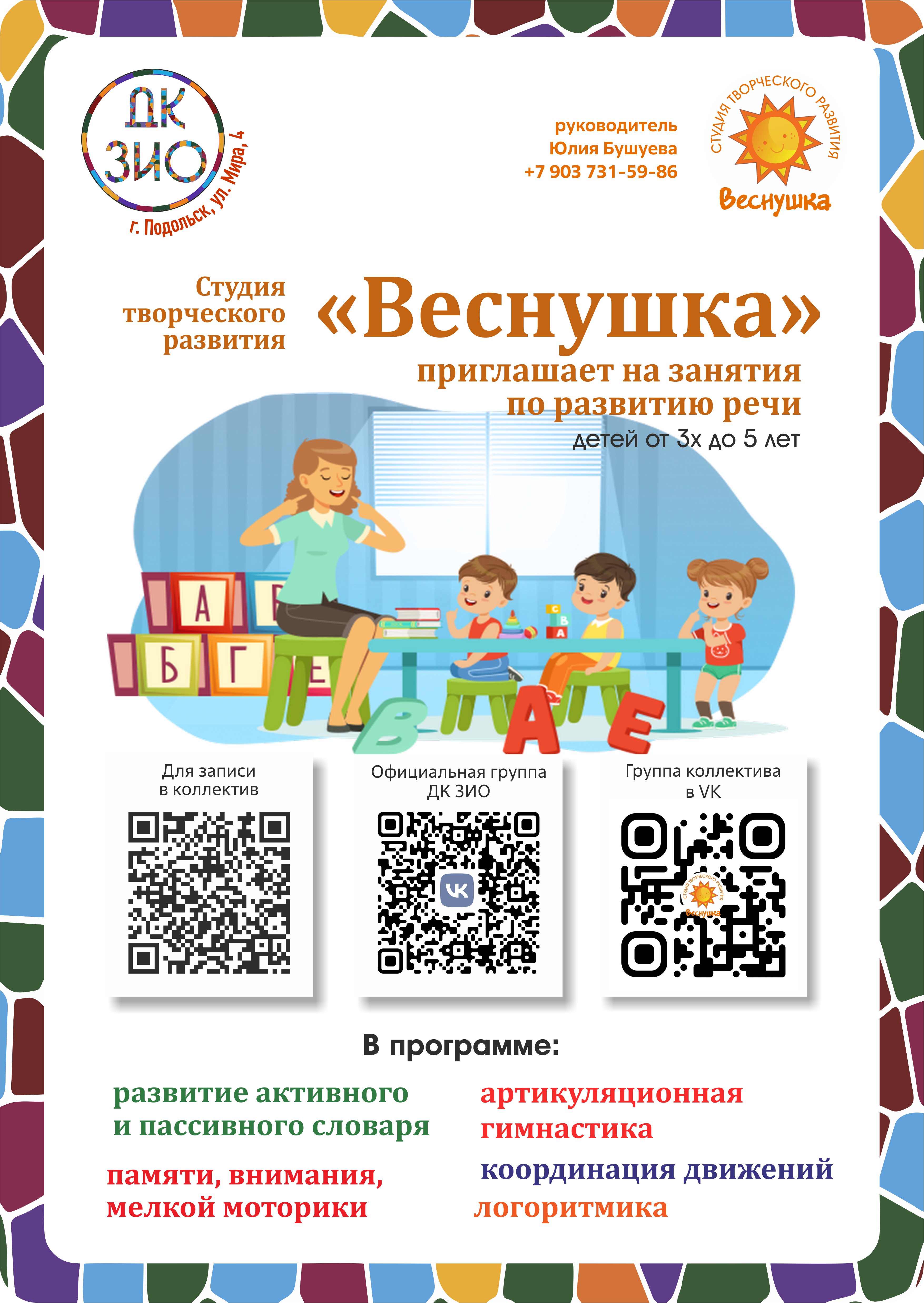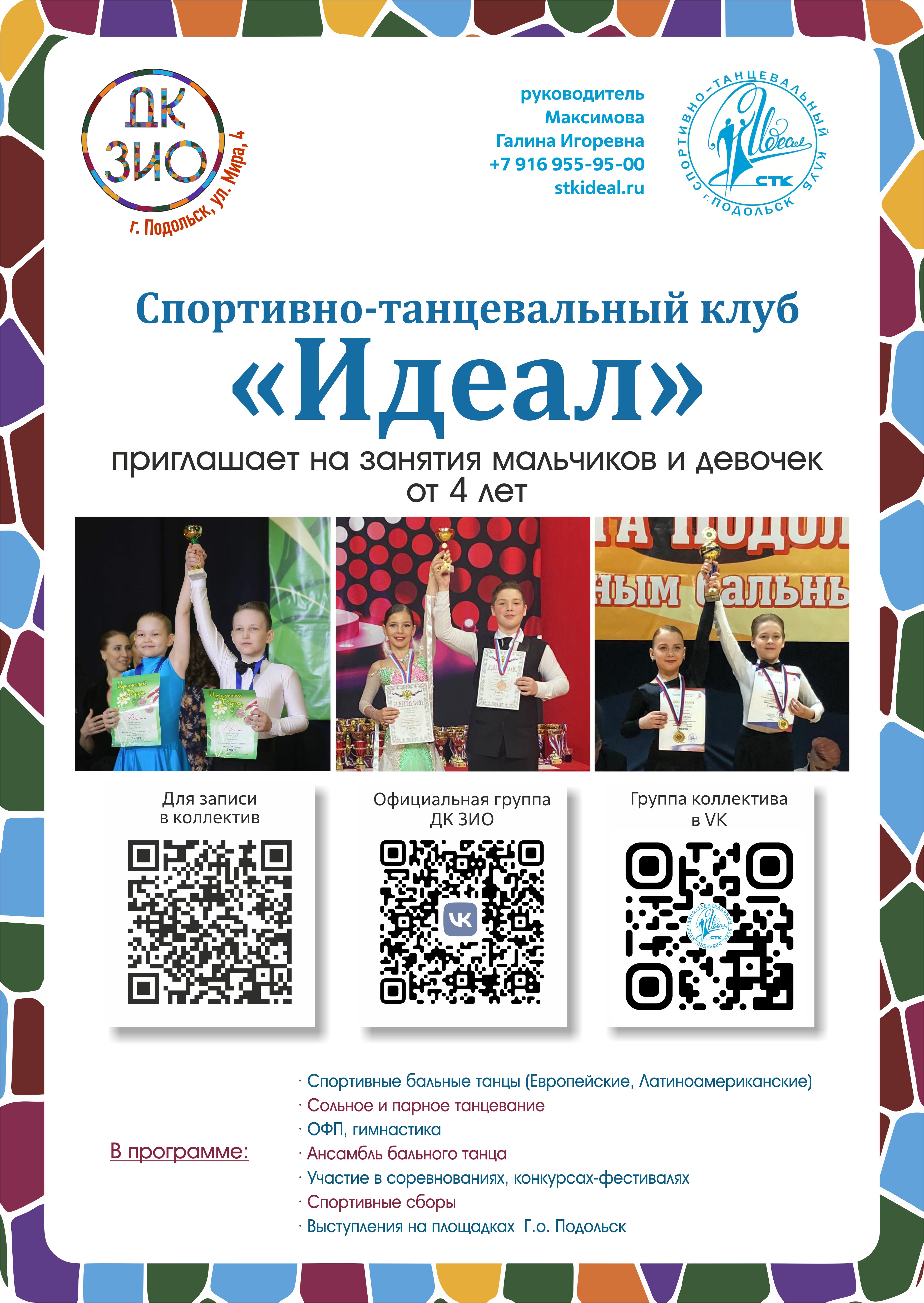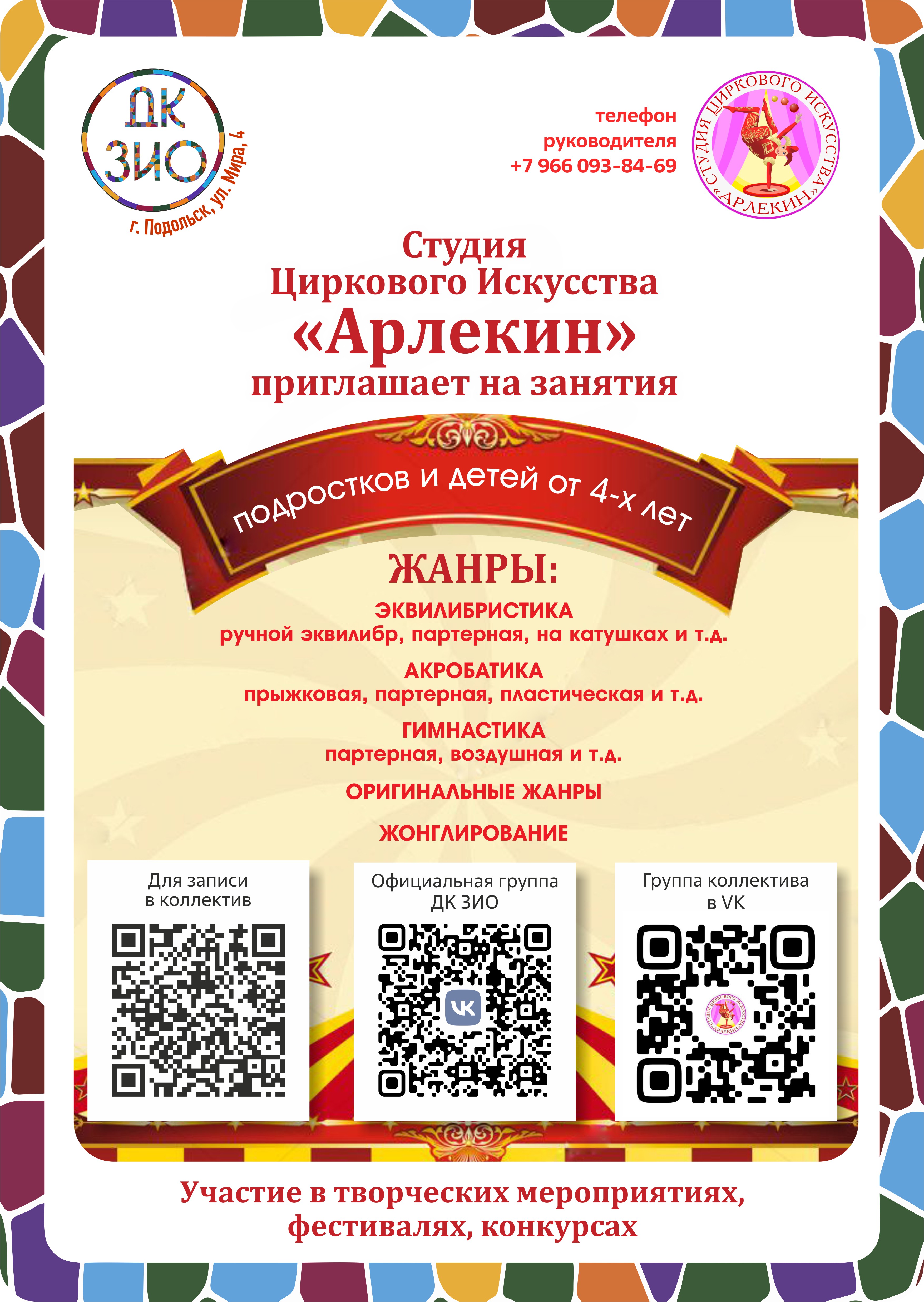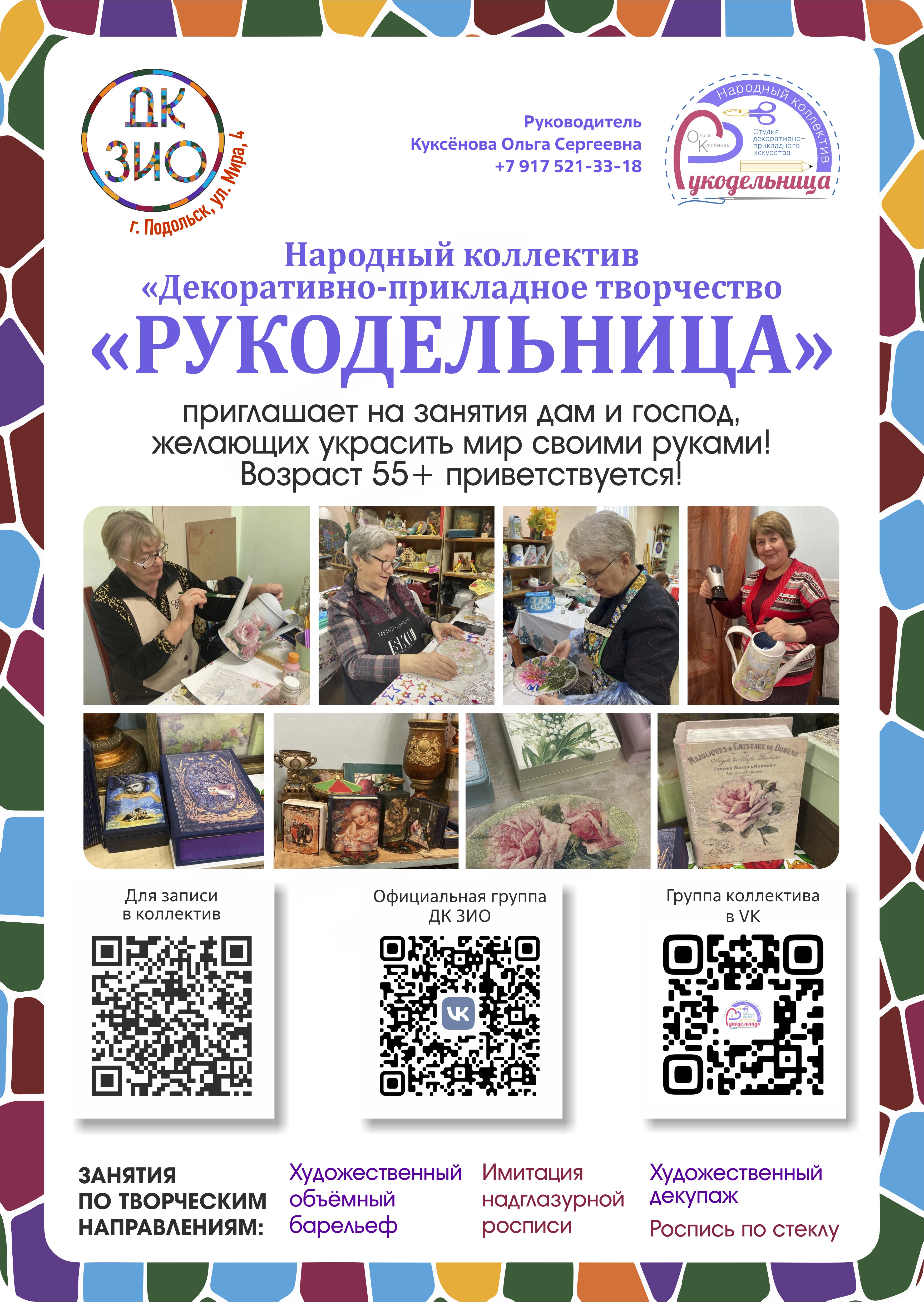 У нас представлены занятия для всех возрастных групп — от детей до взрослых, так же есть занятия по направлению активного долголетия. Для себя вы найдете классы по танцам, рисованию, музыке, театральному искусству и многому другому. Запись в коллективы уже открыта, так что вы можете присоединиться к нам. Начало занятий запланировано на сентябрь. Не упустите возможность развиваться и обрести новые навыки.