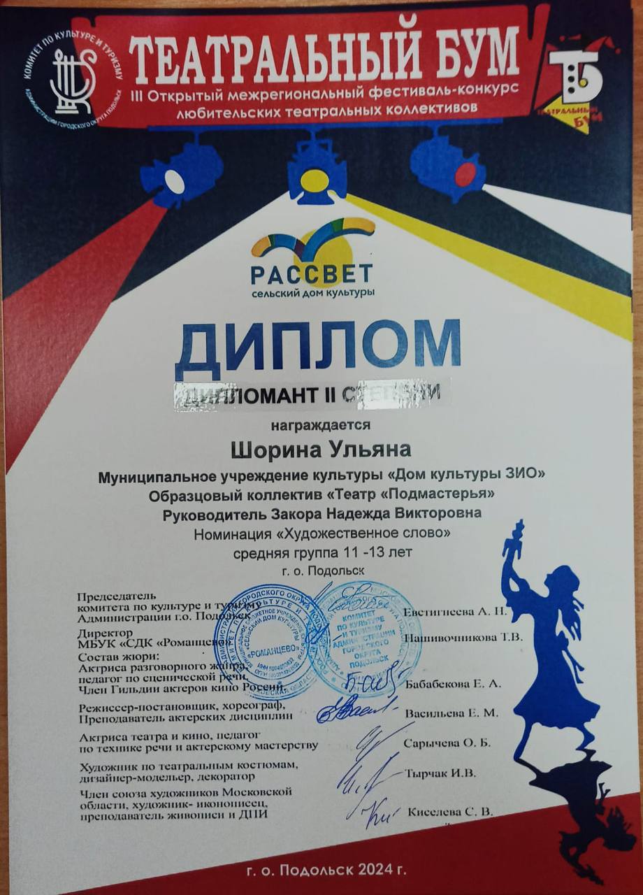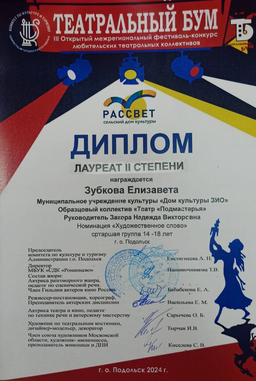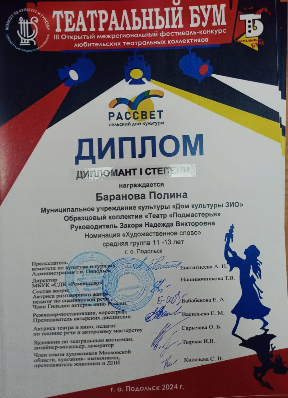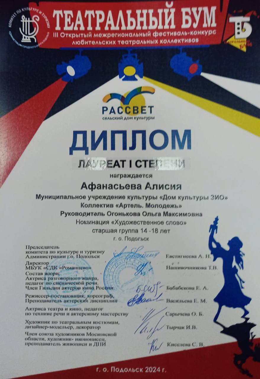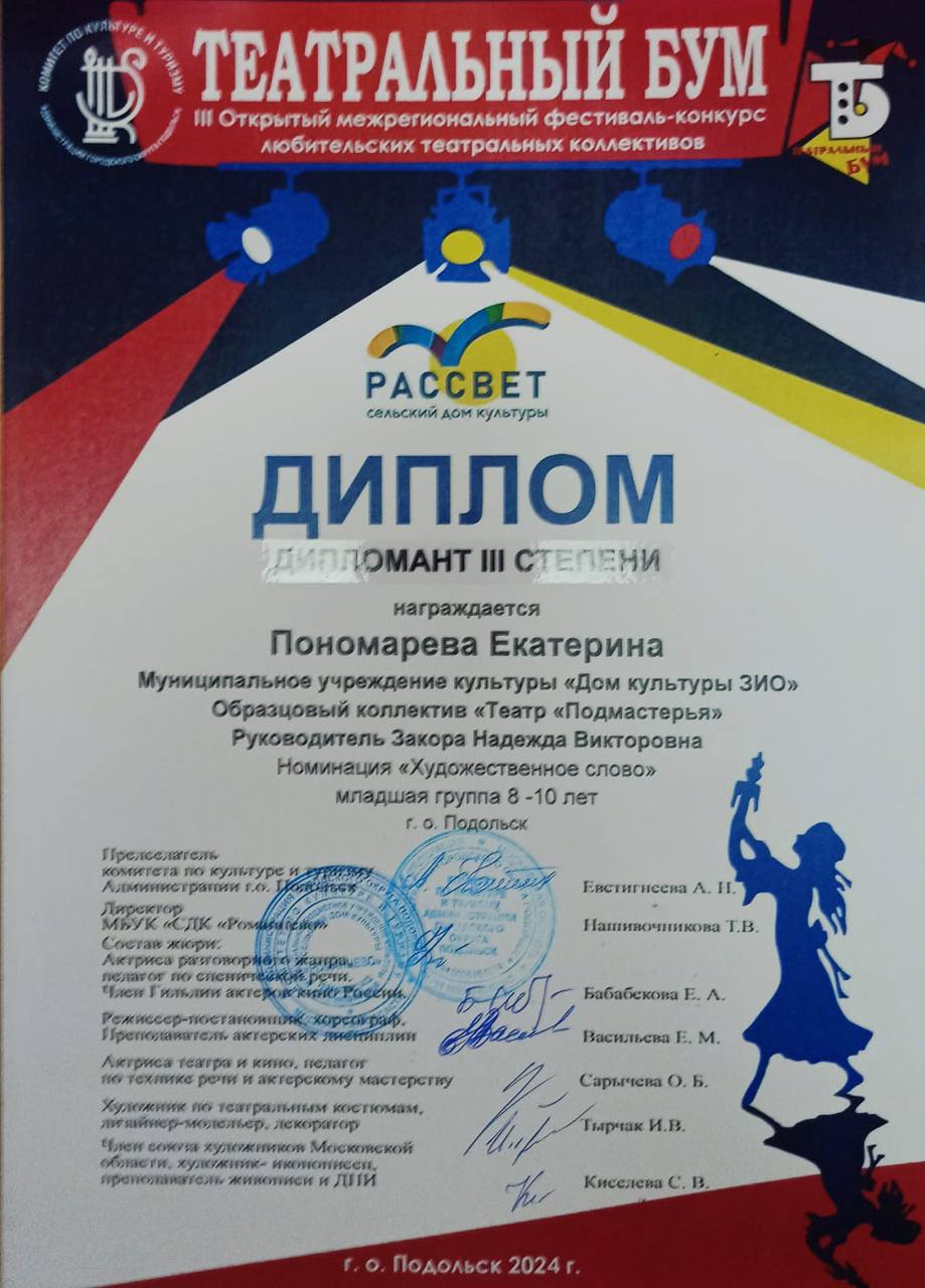III Открытый межрегиональный фестиваль-конкурс любительских театральных коллективов «Театральный бум» принёс успех театральным коллективам Дома культуры ЗИО. Образцовый коллектив «Театр ‘Подмастерья'» и театральный коллектив «Артель. Молодежь» активно приняли участие в этом событии.