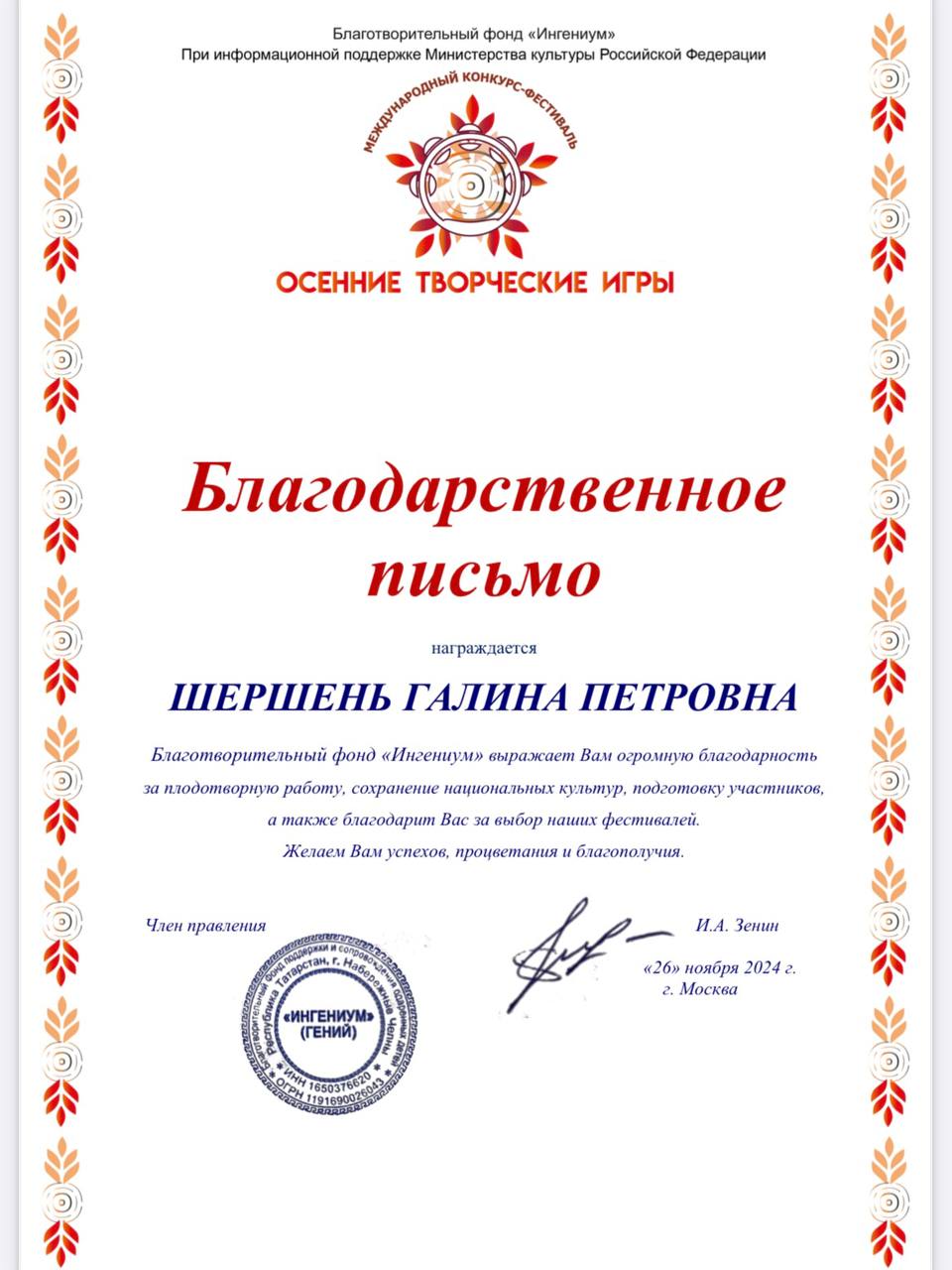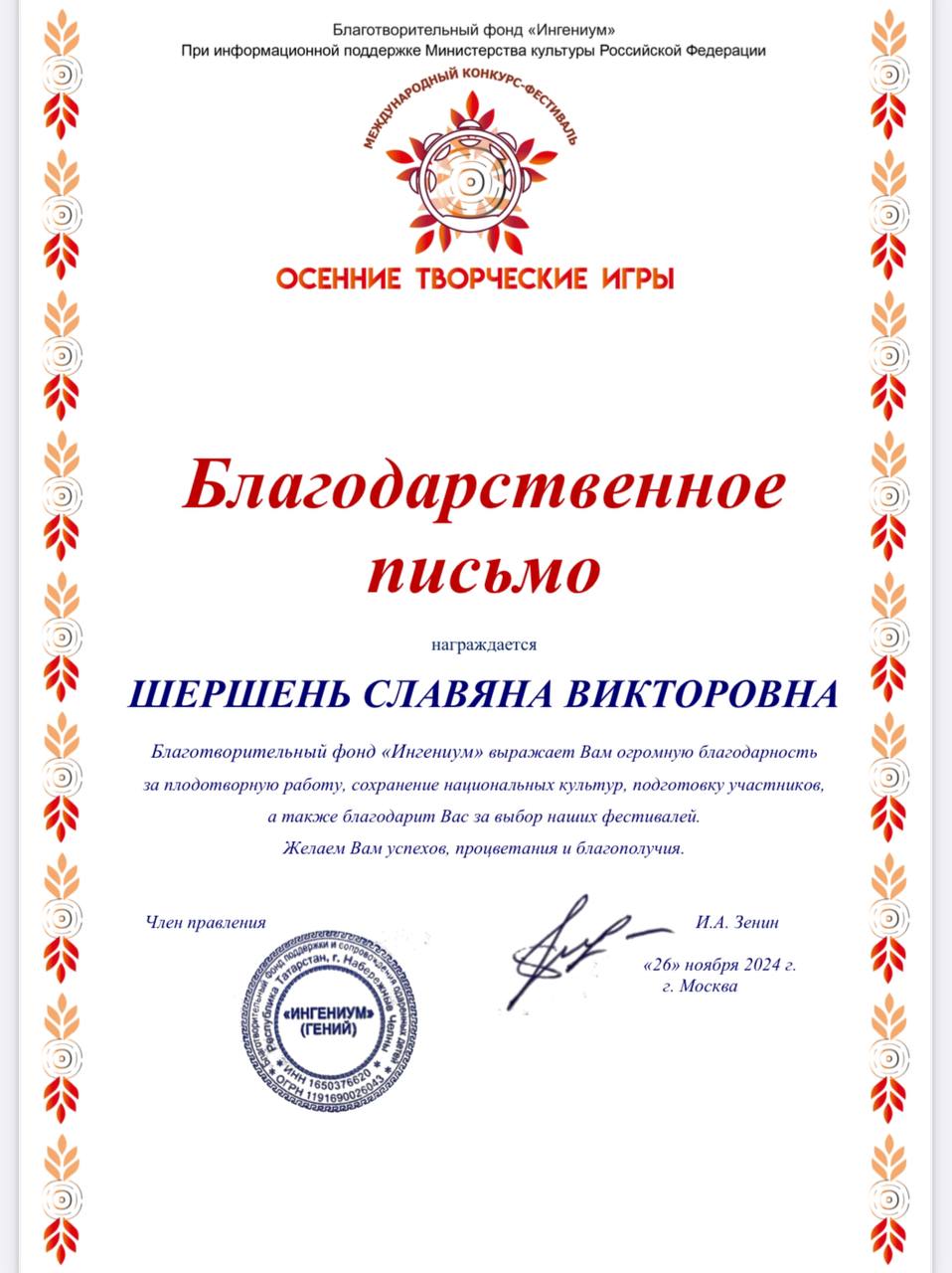 Выражаем искреннюю благодарность Шершень Славяне Викторовне и Шершень Галине Петровне за их выдающийся вклад в развитие и сохранение народного искусства.