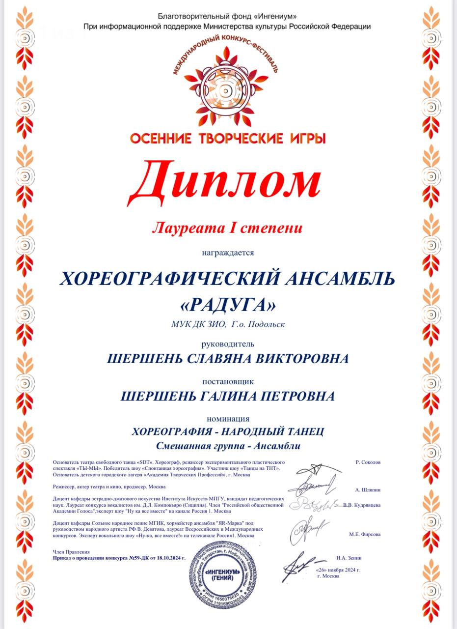 Хореографический ансамбль «Радуга» принял участие в международном конкурсе-фестивале «Осенние творческие игры», который прошел при информационной поддержке Министерства культуры Российской Федерации. Коллектив стал обладателем диплома лауреата 1 степени.