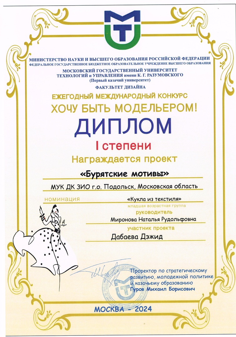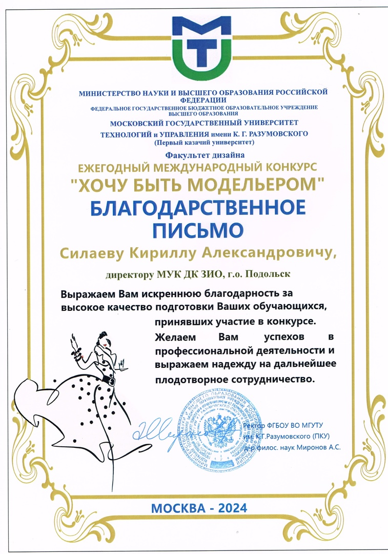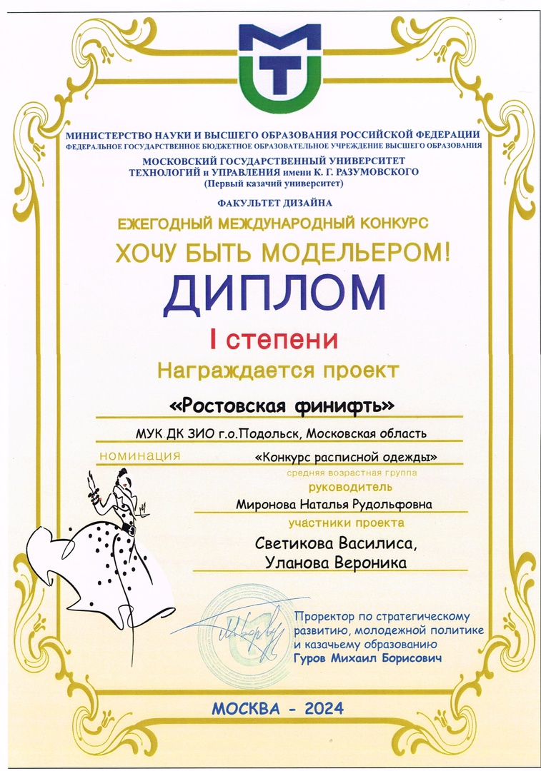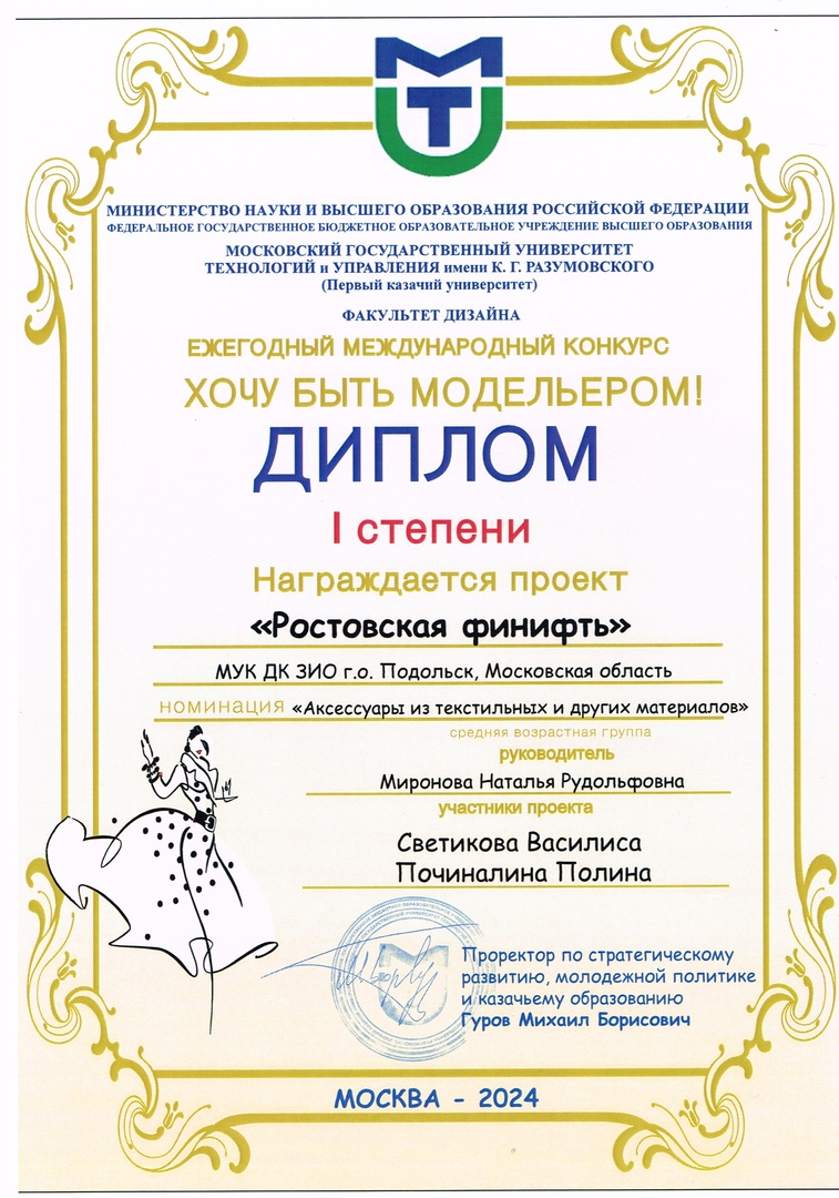 Образцовый коллектив Театр моды «Любава» стал финалистом Международного конкурса «ХОЧУ БЫТЬ МОДЕЛЬЕРОМ», завоевав признание за свои выдающиеся работы. Участники театра были удостоены высоких наград в трех номинациях: «Расписное платье», «Аксессуары из текстильных материалов» и «Авторская кукла». Среди 91 проекта, прошедшего в финал, их работы получили заслуженные отличные оценки. Торжественное награждение состоялось 7 декабря в Московском Государственном Университете технологий и управления им. К.Г. Разумовского. Это событие позволило финалистам пообщаться с ведущими специалистами кафедры «Дизайна» Университета и обменяться опытом. Организаторы подготовили для участников приятный бонус — увлекательная экскурсия и знакомство с процессом обучения на кафедре, а также беседа с ректором и ведущими преподавателями.